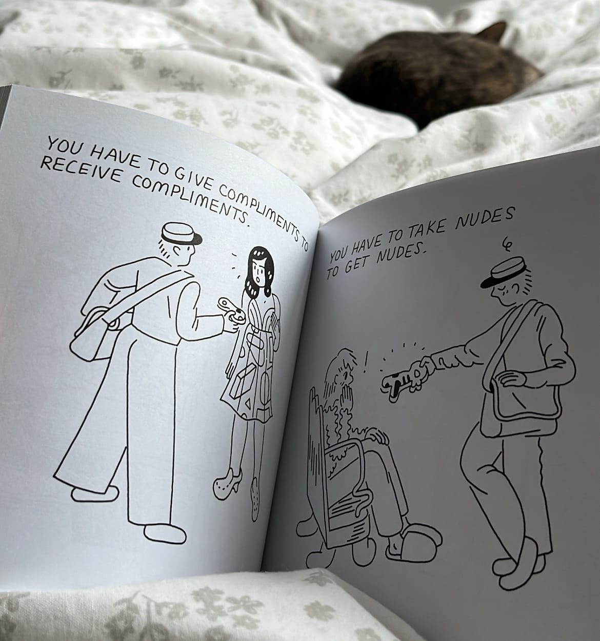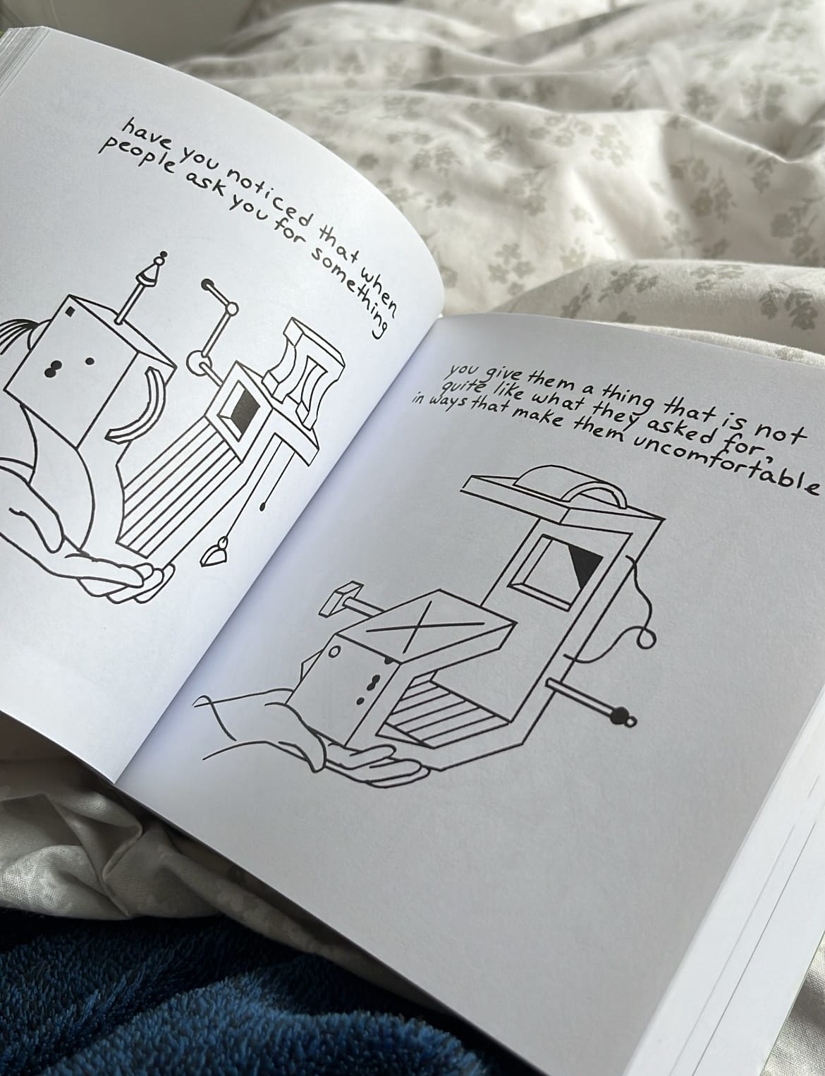 Or maybe it isn't a picture book, maybe this is a dumb thing to assert. Maybe it's a comic. She calls it a comic, it's published by a comics publisher. It's probably a comic. But... could you have a picture book for adults? I mean, not that lots of picture books don't have a lot to offer an adult reader - I was talking about this with Eleanor earlier and I started describing the board book Your Truck by Jon Klassen and she was like... are you crying?? (I was). But can you have a picture book that is explicitly not for children? Does this exist already? Please, write in if so.