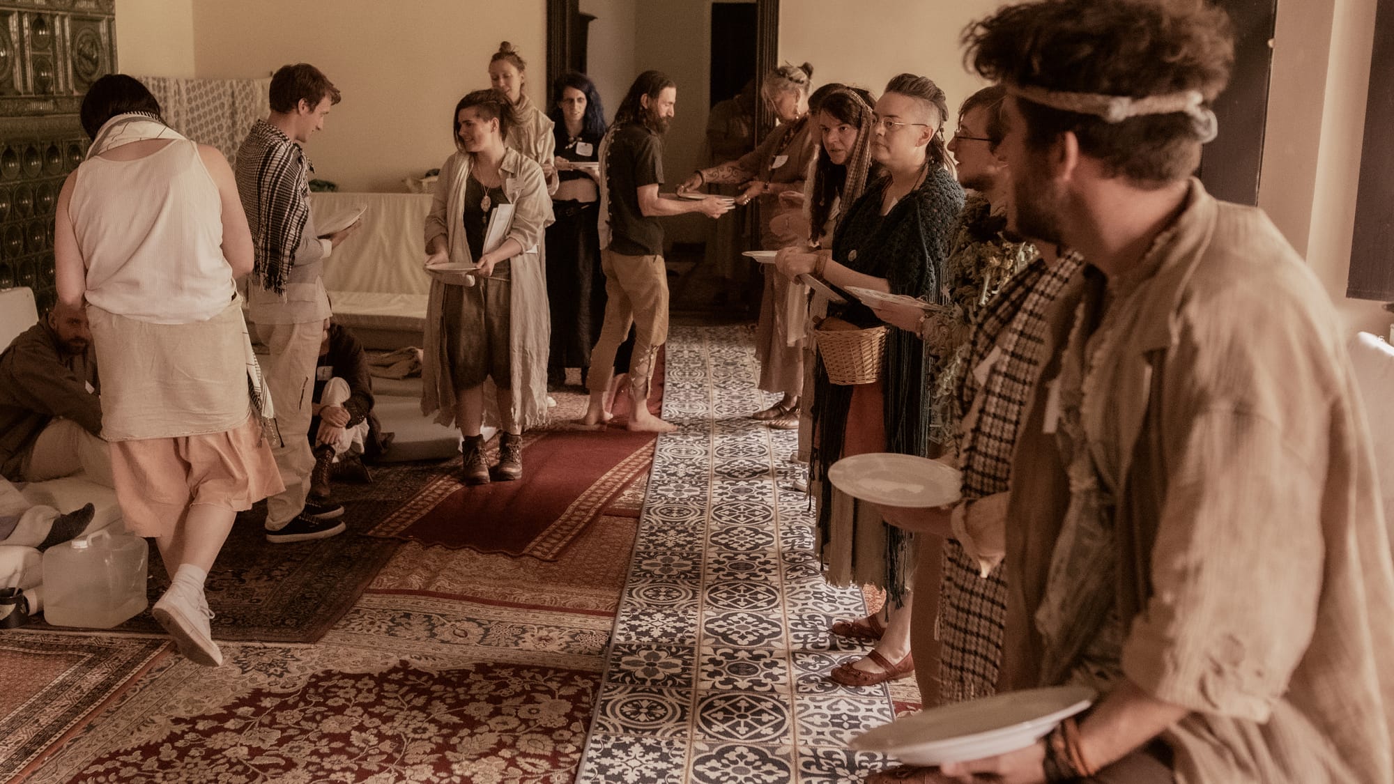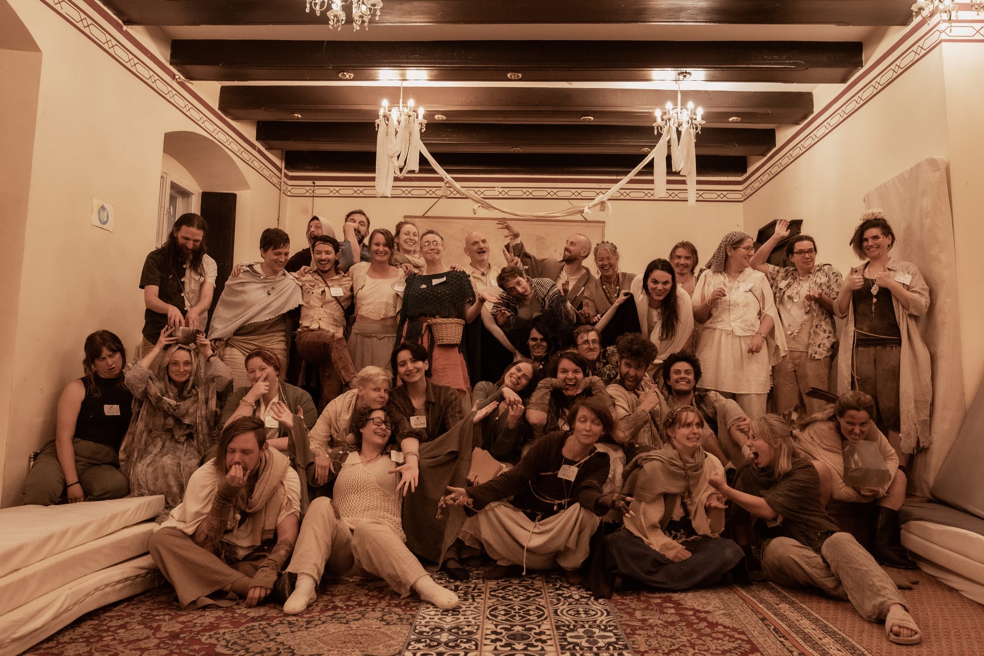 The larp had a three act structure – wait, before I go into that I should sketch out the experience as a whole. Ahead of the larp there was homework - a costume to prep, a player guide to read, and a character sheet to internalise. On Thursday I woke up in Berlin, got breakfast at the hostel, and got a train to the airport (it ran late). I there met with fellow players who were giving me a lift to the venue, a mansion in Poland a few hours drive away. We arrived and unloaded, and I sat a little awkwardly waiting for the larp to start. I didn't know any of the other players, or the organisers (except one player who I had talked to a little at AMAZE earlier in the year). The afternoon was then taken up by workshops - structured exercises to prepare us to play - and then we entered into the House that evening. This was the start of Act 1, which was meant to be low conflict - setting a baseline of harmony among the Children, and letting us settle into our characters. We slept within the game, had breakfast within the game, and then had our first break - an hour to reset and do calibration (jargon for discussing how our characters will relate to each other, and what kinds of play we might give each other). Then back into the game for Act 2 - for this, the larp runners told us we were aiming to add a little more tension, but not to get as far as open conflict. We played within Act 2 for most of the day, and then there was a final calibration break - a longer one this time - in the evening, and then we were in Act 3, where we were told the intensity could reach new heights ("but you should still stay together as a community, and don't die"). We played through the evening, slept, and then played through to the climax of the larp the next evening. There was a couple of hours of practical info and workshops to decompress, and then there was a party - alcohol, a disco, lots of very hyper chatting, some people hooked up. And then we woke early in the morning, helped the organisers pack up and reset the venue, and then I got a lift back to Berlin and arrived exhausted at my friend's apartment, where I am writing this (the next day). That's four days in total, with a solid 48 hours within the fiction of the House itself.